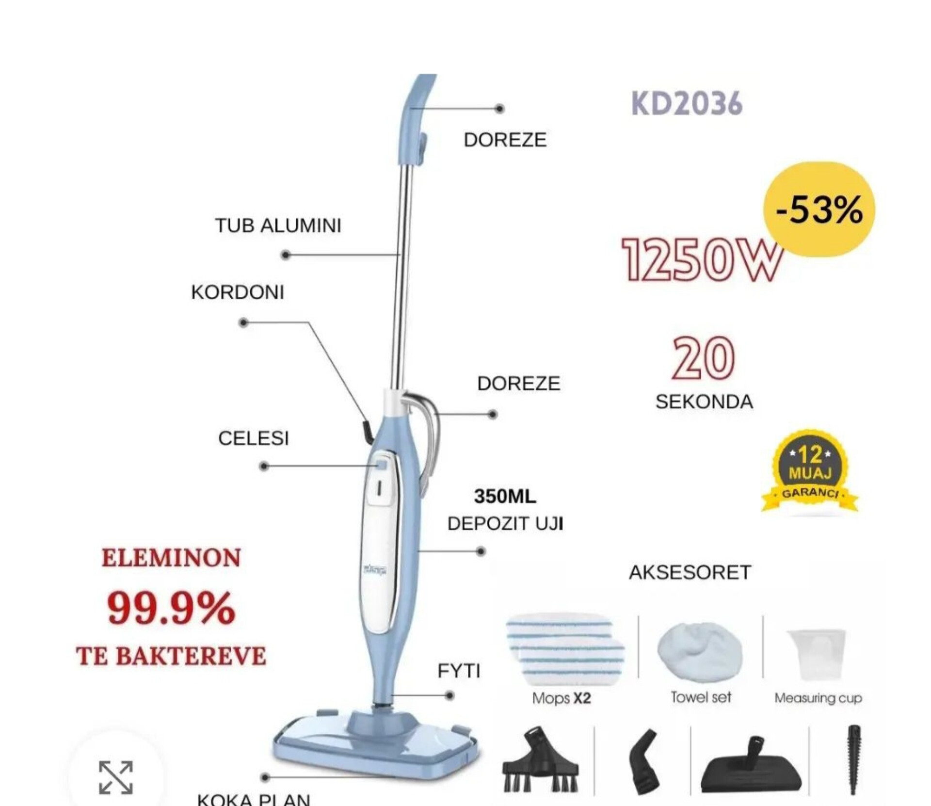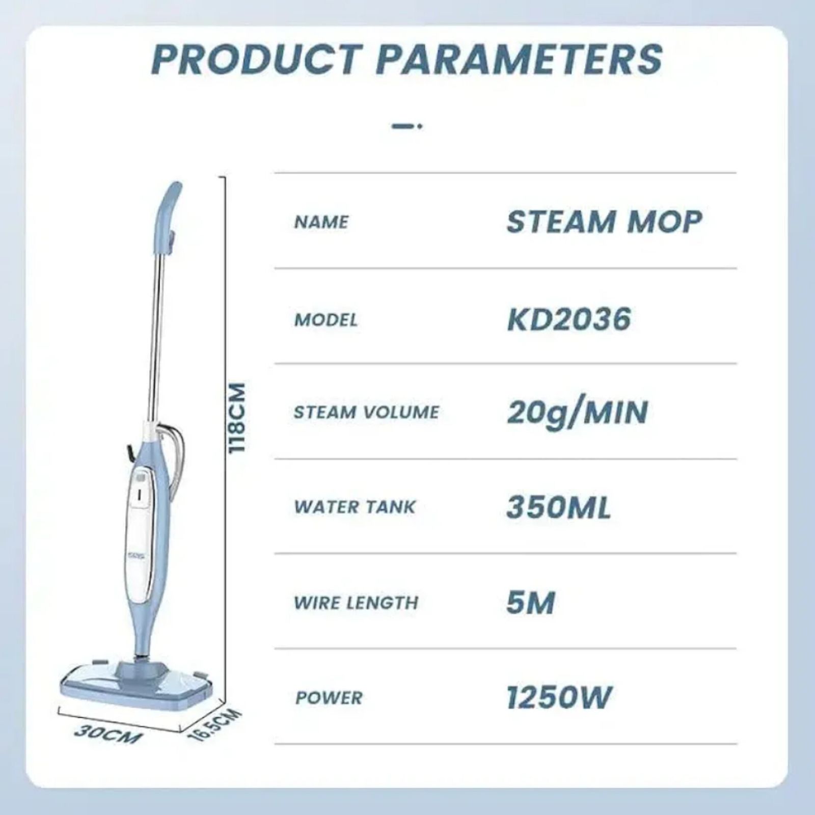 بخارشوی دی اس پی مدل DSP Steamer Mop Kd2036 نام تجاری: DSP مدل: KD2036 قدرت: 1250 وات زمان راه اندازی: 20 ثانیه طول کابل: 5 متر